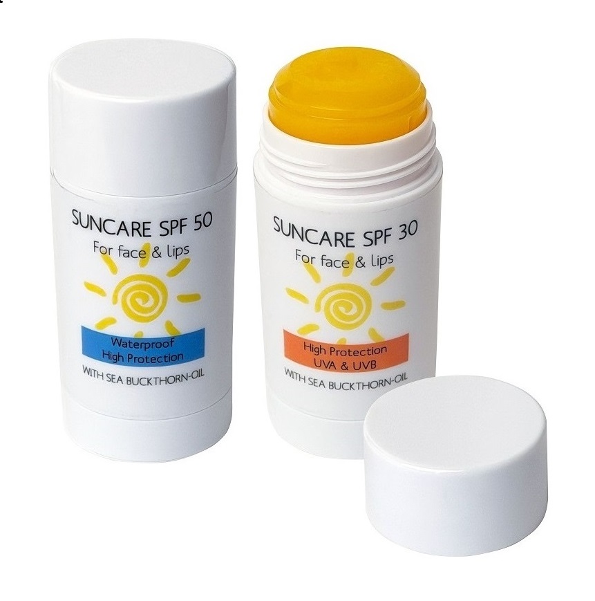 Sonnenschutz mit LSF 30 oder wasserfester LSF 50 Naturkosmetik-Rezeptur für Gesicht und Lippen im handlichen Drehstift. Der Stick passt in jede Jackentasche und wird mit einem 4c Etikett veredelt.